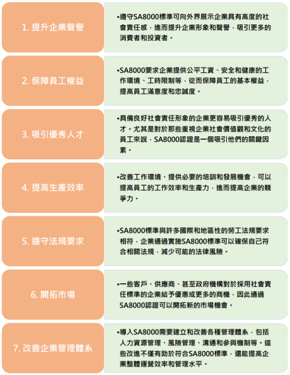 整體來說,導入SA8000標準不僅有助於企業在道德層面上履行社會責任,更能帶來實質的商業價值和利益,這些好處將有助於企業長期發展和永續經營。